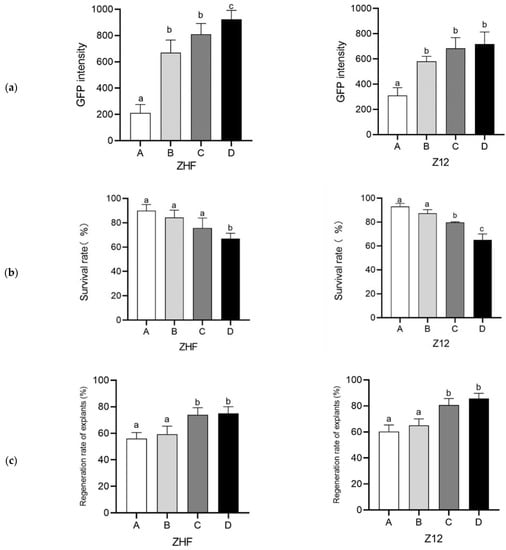 Transformation efficiency of ZHF and Z12 cultivars subjected to different treatments.