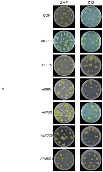 Somatic embryogenesis involves complex cellular reprogramming and the activation of various signalling pathways. Several molecular genetic studies have suggested that the ectopic expression of transcription factor genes induces spontaneous somatic embryogenesis. Transcription factor genes, key regulators of plant cell totipotency, are ectopically expressed and induce somatic embryogenesis without requiring exogenous plant growth regulators or stress [26,27]. Furthermore, the ectopic expression of DR genes stimulates signalling pathways that promote cell proliferation and morphogenesis during embryogenesis [17,21,25,28,29,30,31,32]. Although shoot induction directly from cotyledons via organogenesis occurs at high rates in melons, transformed cells are usually concentrated 2–3 mm away from the cut sides, where shoot formation is rare. To test the effects of DRs on melon transformation via organogenesis, we cloned several Arabidopsis DRs reported to enhance cell division and embryogenesis in other species (Figure 2a). As melon transformation is highly genotype-dependent, we overexpressed these DRs individually in two melon cultivars (ZHF and Z12) and investigated the effects on the transformation efficiency. These two lines showed enhanced transformability when AtGRF5 and AtPLT5 constructs were used in the medium with or without hormone combinations (Figure 2b). ZHF and Z12 showed average transformation efficiencies with the control construct of 1.1% and 2.2% in the MS medium without hormones and 3.7% and 4.8% in the medium with hormone combinations, respectively. By contrast, introducing the 35S: AtGRF5/AtPLT5/AtBBM/AtWUS/AtWOX5/AtWIND1 constructs into the explants resulted in higher transformation efficiencies than those of the control experiment in both treatments (no hormones and the combination of 6BA and ABA). The overexpression of AtGRF5 and AtPLT5 in ZHF resulted in transformation efficiencies of 20.3% and 16% in hormone-free medium and 42.3% and 33% in medium with 6BA and ABA. In Z12, the overexpression of AtGRF5 and AtPLT5 resulted in transformation efficiencies of 26.1% and 11%, respectively, in hormone-free medium and 45.6% and 32.9% in medium containing 6BA and ABA. Transgenic explants containing the AtGRF5 and AtPLT5 overexpression cassettes produced more positive shoots in co-transformation experiments, suggesting that AtGRF5 and AtPLT5 improve transgenic event recovery. In addition, shoot formation capacity was higher using hormone combinations compared to non-hormone cultures. The transformation of AtBBM/AtWUS/AtWOX5/AtWIND1 in melon explants resulted in increased transformation efficiency, although the differences were not statistically significant (Figure 2b,c).