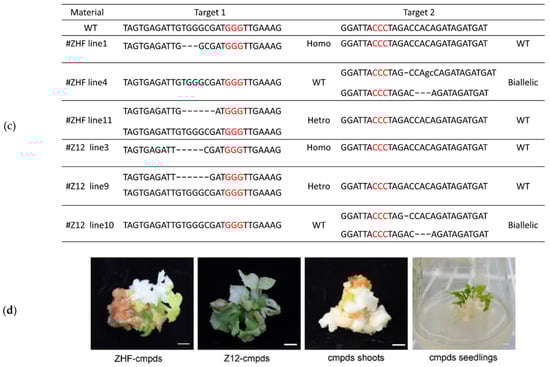 Developmental regulators (DRs) facilitate the CRISPR/Cas9-mediated genome editing of CmPDS. (a) Schematic diagrams of the CRISPR/Cas9 vector with DRs. (b,c). Mutation types at two target sites in CmPDS from ZHF and Z12 transformed with the AtGRF5- and AtPLT5-mediated CRISPR/Cas9 system. “D” indicates a deletion; ”I” indicates an insertion. The number indicates the length of each mutation type (bp). The PAM sequences for the two target sites are highlighted in red. (d) Phenotype of the regenerated CRISPR/Cas9-mutated plants. ZHF-cmpds and Z12-cmpds show fully albino plants regenerated from individual transformation. CmPDS shoots regenerated from transformed explants. When CmPDS shoots were transferred to the rooting medium, PDS disruption resulted in seedlings with photobleached or white leaves. Bars = 10 mm.