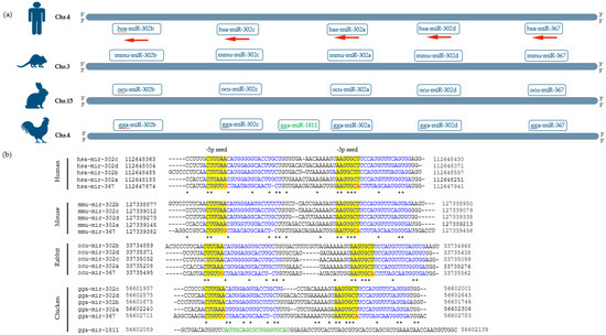 Genome organization and multiple sequence alignment of miR-302/367 precursor coding regions in humans, mice, rabbits, and chickens. (a) Humans, mice, rabbits, and chikens exhibit a common cluster structure, comprising four miR-302s and one miR-367. Interestingly, chikens express an extra miRNA, gga-miR-1811, within the miR-302/367 cluster. (b) Multiple sequence alignment of miR-302/367 precursor coding regions in humans, mice, rabbits, and chickens represent high similarity of this cluster. The seed sequences are highlighted in yellow; mismatches are shown in red. Mature -5p and -3p miRNA sequences are shown in blue. Mature sequence of gga-miR-1811 is shown in green. The asterisks indicate sequence homology.
