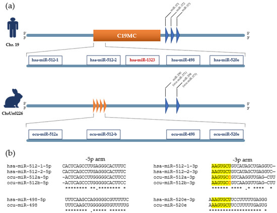 It has been suggested that C19MC miRNAs are primate-specific and have no orthologous regions in the mouse genome; however, we have previously identified three homologs in rabbits, including ocu-miR-512, ocu-miR-498, and ocu-miR-520e [47]. All three mature rabbit miRNAs presented high sequence similarity to their human homologs. They are located 5′ to the rabbit miR-290/295 cluster on the reverse strand of the pseudo-chromosome chrUn0226 in the same order as in humans (Figure 3a,b). Ocu-miR-520e shares the common consensus seed sequence of “AAGTGCT” with its human homologs, but ocu-miR-512 harbors a slightly different seed sequence.