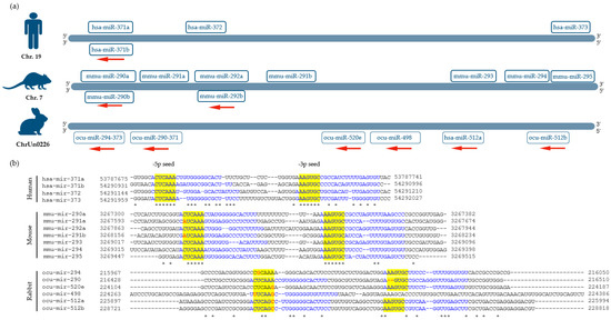 The mmu-miR-290/295, hsa-miR-371/373, and ocu-miR-290/295 clusters are highly conserved in humans, mice, rabbits, chimpanzees, rats, dogs, and cows [128,129]; however, some differences are present in their structure, number of members, and genomic location.