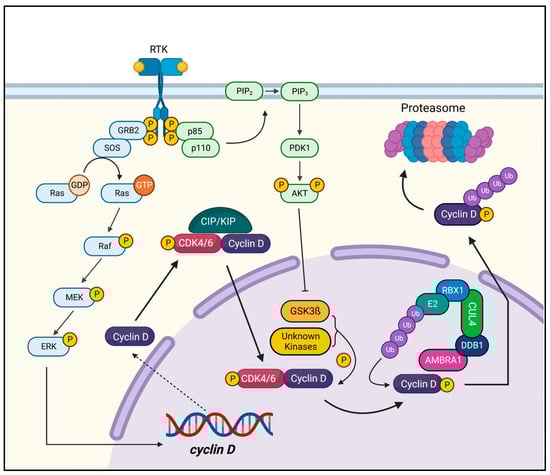 D-type cyclins serve as key endpoints of mitogenic signalling, acting as important growth factor sensors. Their transcription and activation are heavily dependent on receiving and integrating mitogenic signals from the Ras/Raf/MAPK (cyclin D synthesis), PI3K-Akt (cyclin D stability), and ß-catenin/TCF-LEF pathways [20,21,22]. Furthermore, D-type cyclins are highly labile, with proteasomal degradation occurring at rates comparable to their production. Cyclin D-CDK4/6 complexes are deactivated by the phosphorylation of a key regulatory C-terminal threonine (CCND1:Thr-286, CCND2:Thr-280, CCND3:Thr-283) by GSK3ß via the PI3K/AKT3/mTOR pathways, followed by export out of the nucleus, ubiquitylation in the cytoplasm by SKP1-Cullin1-F-Box (SCF) E3 ubiquitin ligase, and degradation at the proteasome [7,23,24].