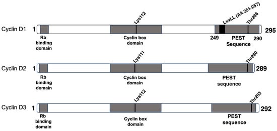 Comparison of cyclins D1, D2, and D3. The three D-type cyclins share a number of conserved sequences and domains. The Rb-binding domain, located at the N-terminus, is responsible for binding the C-terminal helix of Rb when cyclin D is bound to CDK4/6. The cyclin box domain is a heavily conserved region of ~100 amino acids located in the N-terminus of each D-cyclin, which facilitates binding to CDK4/6. Mutagenesis of Lys112 (CCND1 and CCND3) and Lys111 (CCND2), in particular, abolishes binding to CDK4, demonstrating the residue’s essential role in mediating CDK-binding. The PEST sequence located at the C-terminus is required to mediate the degradation of cyclin D. Mutations at the Threonine phosphodegron site induce the stabilisation of cyclin D, resulting in increased progression of the cell cycle into the S-phase and genomic instability. CCND1 also possess an LxxLL motif, which mediates ligand-dependent interaction with nuclear receptors such as Erα.