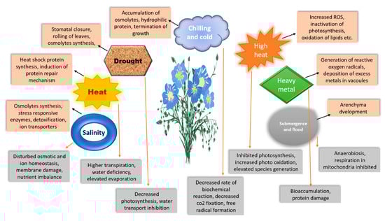 To achieve agricultural sustainability, it is critical to develop and nurture products that are tolerant to rising abiotic pressures caused by climate variability [49]. Numerous abiotic and biotic stressors that constantly threaten plants have an impact on their outputs. Through intricate endogenous signalling networks and numerous modifications, the plant reacts to these stressors. Under these environmental circumstances, the plant’s output and reproductive success are determined by the interactions between these networks. Linseed, like other crops, if subjected to a variety of abiotic stresses, might have reduce yields [59]. The different abiotic stresses influencing linseed are summarised in the following subsections.