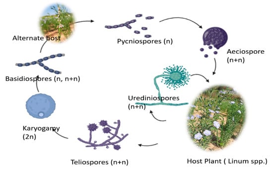 In contrast to many other rusts that need different hosts, flax rust is an autoecious rust, meaning that the fungus may go through all four phases of its life cycle—pycnia, aecia, uredia, and telia—on the flax plant (Figure 2). Field inspectors seldom ever see the pycnia and aecia, which typically occur on cotyledons and lower leaves early in the season. The stages of pycnia and aecia are crucial for the fungus to complete its sexual life cycle and for the emergence of new races. The uredia are this fungus’ third developmental stage. Since uredia develop cycles of urediniospores that might lead to new infections with each cycle during the growing season, the uredial stage is the most harmful to the crop. When the fourth stage reaches maturity, it generates tough overwintering teliospores that can endure inclement weather [120].