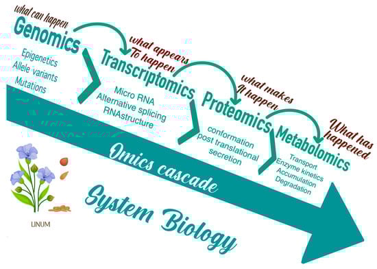 An overview of the use of omics approach, which depicts how the information is passed on from genomics to transcriptomics, then to proteomics, and finally to metabolomics, which bring about the final change in response to a stress or signal.