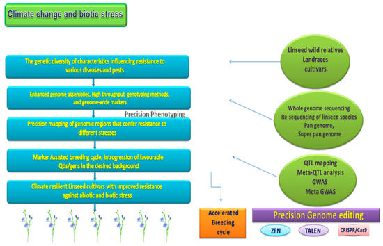 In the years to come, climate change may put enormous pressure on the breeding society to breed varieties [49] having adjustableproperties underadverse climatic conditions. For any crop to be improved or adjusted to changing environmental conditions or market demands, access to genetic variability is a must, and the availability of diverse germplasm lines of the targeted crop plays a significant role in it [10,50,51,52]. A variety of germplasms, including wild relatives, landraces, commercial, extinct, and elite varieties, pure and breeding lines, mutants, polyploids, and hybrids, are found in gene bank collections [11] and can be exploited for the improvement of the crop. There are 46,513 linseed/flax accessions documented in global germplasm collections, of which L. bienne (the wild ancestor of farmed flax) is only intermittently represented in gene banks [53]. Breeders can use these plant genetic resources of linseed for the improvement of linseed crops with potential climate adaptations [54,55]. Following the preliminary assessments of flax germplasm collections, subsequent evaluations for different characteristics associated with tolerance to different biotic and abiotic stress factors were carried out [56,57], alongside the present concentration on the germplasm screening of single-gene attributes, such as disease resistance [58]. As a result, the extensive diversity found in linseed germplasm collections, along with data on characterisation and assessment, is a potential source that is worth using in breeding for abiotic and biotic stresses. The current review focuses on all the advancements made in the flax research programme to overcome these stresses.