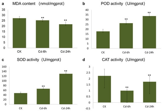 Malondialdehyde (MDA) is the final product of membrane lipid peroxidation, and its content can directly reflect the toxicity of Cd to plants. The increase in MDA content reflects an increase in the concentrations of -OH, O2−, and other free radicals in the body to a certain extent. Figure 1a showed that the MDA content in buckwheat leaves decreased with increasing Cd treatment times, and the difference between the control versus Cd—6h treatment and the control versus Cd—24h treatment was very significant (p < 0.01). The promotion rates after 6 and 24 h of treatment were 25.253 and 21.724 m mol/g, respectively. The decrease in MDA content was caused by the increase in antioxidant enzyme activity in plants induced by Cd and the timely removal of excess -OH, O2−, and other free radicals.