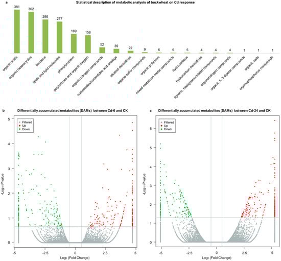 Through metabolite screening, a total of 1798 metabolites were identified. All the metabolites were divided into 19 categories (Figure 2a), wherein 68 classes were identified. Differentially accumulated metabolites (DAMs) were considered to determine significant differences between samples. A total of 479 up-regulated and 406 down-regulated metabolites were observed between the 6-h treatment (Cd—6) and control (CK) groups (Figure 2b). In the second treatment period (24 h), 612 up-regulated metabolites and 578 down-regulated metabolites were observed, respectively (Figure 2c). Corresponding to the observed phenotypic variation, the metabolism in buckwheat cells changed dramatically under Cd stress.