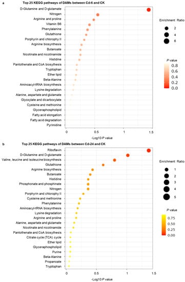 The top KEGG pathways of all DAMs between different treatment stages. (a) The top 25 KEGG pathways of DAMs between Cd—6 and CK. (b) The top 25 KEGG pathways of DAMs between Cd—24 and CK. The darker the color, the lower the p value. The larger the diameter of the dot, the more number of genes.