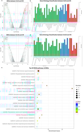 Statistical description of DEGs of high-throughput transcriptome analysis. (a) The volcano plot presents the DEGs between the Cd—6 and CK groups. (b) Top 25 gene ontology classification between the Cd—6 and CK groups (c) The volcano plot shows the DEGs between the Cd—24 and CK groups. (d) Top 25 gene ontology classification between the Cd—24 and CK groups. (e) Top 20 KEGG pathways of DEGs. The darker the color, the higher is the p value. The larger the diameter of the dot, the more abundant the number of genes. In the volcanic map, the horizontal and vertical axes represented the Log2 (fold change) and—Log10p values, respectively; the red and green dots represent the up-regulated and down-regulated metabolites, respectively. In the gene ontology (GO) classification analysis, The abscissa and ordinate represent the name of the GO unit and the number of genes contained, respectively. The green column belongs to the biological process, the blue column belongs to the cellular component, and the red column belongs to the molecular function.