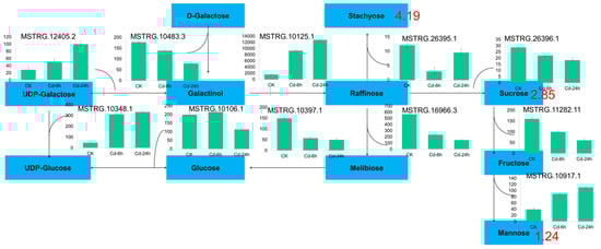 All carbohydrate differential metabolites showed an upward trend, including stachyose (4.19-fold), sucrose (2.85-fold) and mannose (1.24-fold). A total of 20 DEGs were enriched in galactose metabolism, 8 DEGs were enriched in fructose and mannose metabolism, and 30 DEGs were enriched in starch and sucrose metabolism. In this study, 11 selected candidate genes were tested to verify the galactose metabolic pathway, and the results are shown in Figure 5.