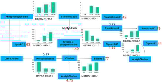 In this study, two glyceride metabolism DAMs, three glyceride metabolism DAMs, and one glyceride and α-linolenic acid metabolism DAMs were enriched in lipid metabolism pathway, Including glycerol triphosphate (1.85-fold), lecithin (1.63-fold), palmitic acid (0.79-fold), betaine (1.77-fold), etc. (Figure 6). The transcriptional showed that DEGs were 12, 12 and 14 enriched in these metabolisms. A total of nine differential genes were enriched in glyceride metabolism, 13 were enriched in glyceride metabolism, and 20 were enriched in glyceride and α-linolenic acid metabolism after 24 h of Cd stress.