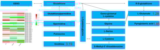 A total of 4 DAMs were enriched in glutathione metabolism, in which 77 DEGs and 81 DEGs were enriched after 6 h and 24 h of Cd stress, respectively. The metabolites involved in glutathione metabolism included ornithine (3.19-fold), glutamic acid (1.28-fold), and pyroglutamic acid (1.85-fold), etc. A heat map of the expression ko00480 genes is shown in Figure 7, showed that 8 genes showed a continuous upward trend. With the extension of treatment time, the expression of 7 genes decreased with the treatment. 9 genes significantly decreased their expression in the first stage of treatment, and increased their expression in the second stage of treatment. Two genes first increased their expression and then decreased their expression. The expression of 4 genes did not change significantly. Changes in the expression of these genes are the main reason for the increase in ornithine and pyroglutamic acid contents and the decrease in the glutamic acid content.