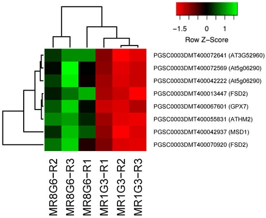 Watkinson et al. (2006) [97] assessed three accession genotypes of drought-stressed S. tuberosum ssp. andigena and made a transcriptomic analysis of genes associated with carbon metabolism, citrate cycle and oxidative stress. In agreement with their results, we found similar genes compared with “intermediate” genotypes, with 20 genes up-regulated under stress conditions, similar to our analysis. The term “intermediate” means plants that recovered their photosynthetic index after one cycle of stress and performed even better in the second, yielding similar results to the control plants unaffected by the stress. This may explain why molecular mechanisms under field conditions are very similar to those under in vitro conditions.