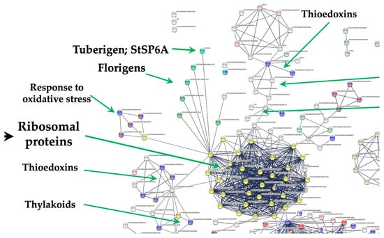 Several transcriptomic analyses of potato tuberization have revealed the presence of RPs during the process [13,14,15,16,17]. From the RNA-seq database published by Sharma and Hannapel 2016 [13], we performed a PPI network analysis with the highest confidence (0.900), revealing that RPs interact with SP6A, RP40SA, RP60S, RPS8, RPS4A, RPL10, BEL5, and RPL14 [13].