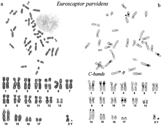 A comparative chromosomal analysis of E. parvidens with available G-banded karyotypes of Euroscaptor species (E. klossi, E. malayana) and the Japanese mountain mole, Oreoscaptor mizura [16,23,35], was performed (Figure 3).