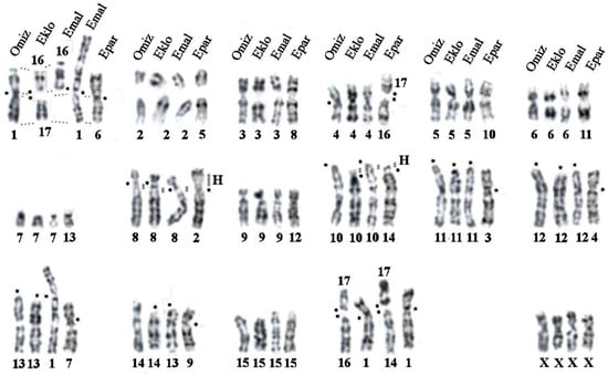 Comparative analysis tracing chromosome homologies between G-banded karyotypes of four Asian mole species from Euroscaptor and Oreoscaptor genera: E. parvidens (Epar), E. klossi (Eklo), E. malayana (Emal), and the Japanese mountain mole, Oreoscaptor mizura (Omiz) [16,23,35]. “H”—designates constitutive heterochromatin blocks. Black dots designate centromere positions.