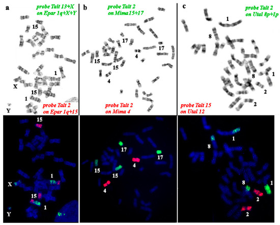 - Chromosomal pairs homologous to TALT 6 are characterized by the amplification of heterochromatic blocks in the centromeric regions of chromosomes TEUR 1p and EPAR 2p (Figure 8a). Small blocks of heterochromatin are present in the centromeric region of all studied species;