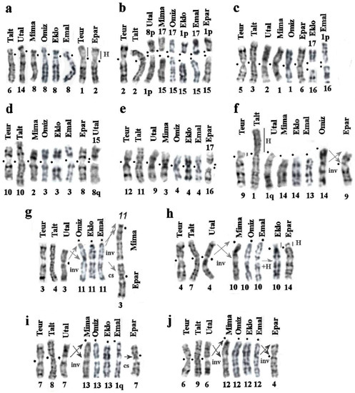 - Chromosomes TALT 7, TEUR 4, and UTAL 4 are homologous. Pericentric inversions of the p-arms led to the appearance of acrocentric chromosomes OMIZ 10, EMAL10, and MIMA 10. The appearance of additional heterochromatic arms on EKLO 10 and EPAR 14 explains their subtelocentric morphology (Figure 8h).