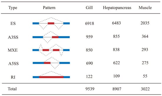 A total of 9539, 8907, and 3022 AS events were identified in the gill, hepatopancreas, and muscle under heat stress, respectively (Figure 1). Although the total number of AS events varied greatly, the distribution profile of five types of AS events (ES, A3SS, A5SS, MXE, and RI) was consistent among the three tissues. In detail, ES was the most abundant event, accounting for 72.52%, 72.79%, and 67.3% of total AS events in the gill, hepatopancreas and muscle, respectively, succeeded by A3SS, MXE, and A5SS. The occurrence of RI was observed in only 1.28%, 1.22%, and 1.82% of AS events across the three respective tissues.