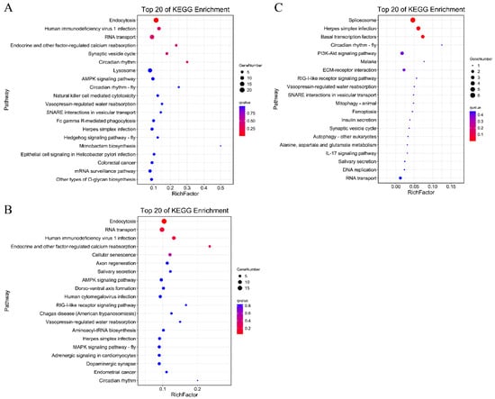 The KEGG enrichment analyses of the DAS genes were conducted to investigate the role of AS in response to heat stress. The result revealed that the DASGs of the gill and hepatopancreas were both significantly enriched at “endocytosis” (ko04144) and the “RNA transport” (ko03013) pathway (Figure 3A,B). As for the muscle, the DASGs were signicantly enriched at “spliceosome” (ko03040) and the “basal transcription factors” (ko03022) pathway (Figure 3C).