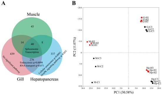 The relationship between the AS patterns among the three tissues. (A) The Venn diagram for the DASGs of the three tissues under heat stress. The enriched or main pathways of all gene sets were visualized below the number of DASGs. (B) The principal component analyses based on the PSI values of all common AS events among three tissues. The black and red points represent control and heat stress groups, respectively. The circles, squares, and stars represent the muscle, hepatopancreas, and gill, respectively.