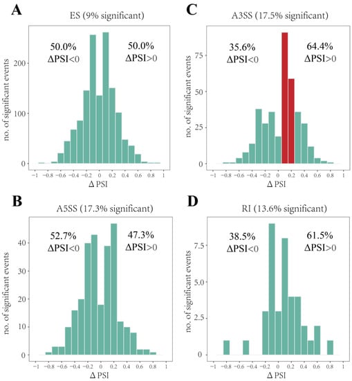 The distribution pattern of the PSI values of each type of AS under heat stress. (A) ES, (B) A5SS, (C) A3SS, and (D) RI. The y-axis represents the number of DAS events. The ratio of DAS events is shown in each figure. The red bars in (B) represent the obvious biases toward the positive values.