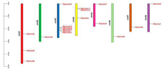 The superfamily of light-harvesting chlorophyll a/b-binding proteins is characterized by the existence of a conserved chlorophyll-binding domain. This superfamily can be divided into four families, namely: Lhc, Lil (light-harvesting-like), PsbS (photosystem II subunit S), and FCII (ferrochelatase II) [6]. Currently, the Lhc gene family has been identified in various plant species, including wheat [26], Arabidopsis [44], rice [44], Cyperus esculentus [45], pear [46], grape [47], kiwifruit [16], cotton [17,42], papaya [48], pomegranate [49], tea plant [50], cassava [51], potato [52], Populus [8], Zostera marina [53], Gardenia jasminoides [54], Ricinus communis [55], barley [56], and apple [25]. In this study, the first genome-wide characterization of the Lhc family was performed in peach. We identified a total of 19 PpLhc members, which is less than those of two other Rosaceae plants: apple and pear, which have 28 and 27 members, respectively [42,46]. Similar to what is observed in apples and pears, PpLhc genes were unevenly distributed on eight chromosomes.