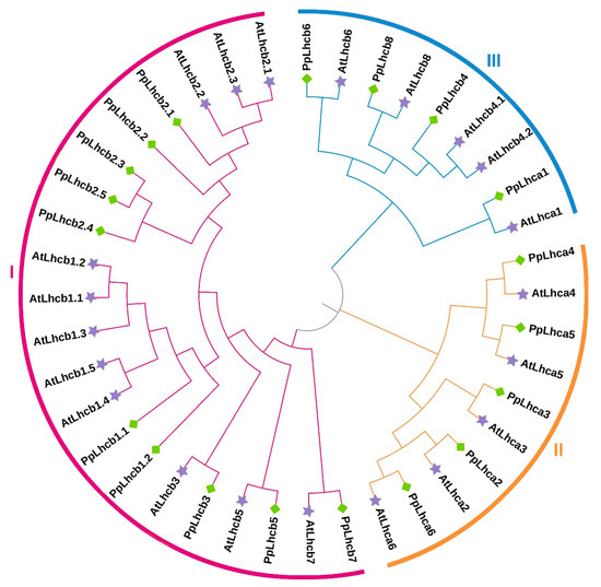 To analyze the phylogenetic relationship between different PpLhcs, we constructed a phylogenetic tree based on the alignment of the Lhc protein sequences from all the Lhc family members in peach and Arabidopsis. It showed that PpLhc proteins can be classified into three subfamilies (I–III), which included 4, 5, and 10 PpLhc family members, respectively (Figure 2). It is worth mentioning that PpLhcb6, PpLhcb8, and PpLhca1 were strictly clustered with AtLhcb6, AtLhcb8, and AtLhca1 in subfamily I. Similarly, PpLhca2–6 in Group II exhibited close clustering with AtLhca2–6, respectively. Moreover, PpLhcb3, PpLhcb5, and PpLhcb7 in Group III exhibited close clustering with AtLhcb3, AtLhcb5, and AtLhcb7 of Arabidopsis, respectively (Figure 2), suggesting that the biological functions of these genes were similar.