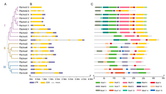 Phylogeny, gene structure, and conserved motif analysis of PpLhcs: (A) phylogenetic tree analysis of 19 PpLhc members; (B) schematic diagram of the exon–intron distributions of PpLhc genes. UTRs are represented by purple boxes, exons are represented by orange boxes, and introns are represented by single lines between the two exons; (C) schematic diagram of the conserved protein motifs of PpLhc members. Motifs 1 to 15 are marked with different colored boxes.