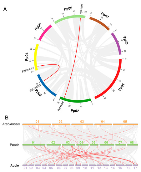 Collinearity analysis. (A) Collinearity analysis of the identified 19 PpLhc genes in peach genome v2.0.a1. The segmentally duplicated pair is indicated by the red line. (B) Large-scale gene collinearity analysis among Arabidopsis, peach, and apple genomes.