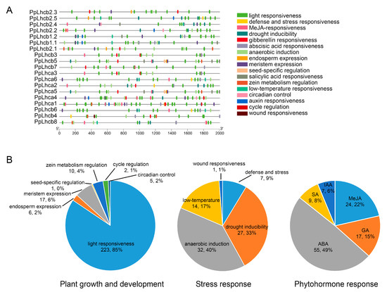 Cis-regulatory elements in the promoters of peach PpLhc genes. (A) The location of the promoter cis-regulatory elements. (B) Distribution of promoter cis-regulatory elements in plant growth and development, stress response, and phytohormone response. Pie chart size represents the proportion of promoter element in each category.