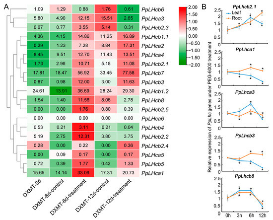 Expression profiles of peach Lhc genes in the root and leaf of cv. “Dong Xue Mi Tao” under drought treatment. (A) Heatmap analysis of expression patterns of PpLhc genes under drought stress at different times. The values presented in the boxes indicate the original TPM values of genes, while the indicator ranges in the upper right corners indicate the range of the values after log normalization. (B) Expression analysis of 5 PpLhcs under drought stress in peach. The horizontal axis represents hours after PEG-6000 treatment, and the vertical axis represents the expression of PpLhc members relative to the internal control gene PpActin. The relative expression was calculated with respect to control samples (0 h). The error bars represent ± SE of three replicates. Statistical significance was assessed using two-tailed t-tests (* p ≤ 0.05).