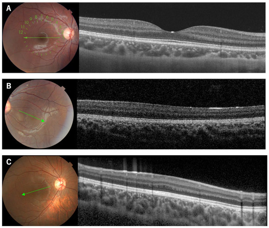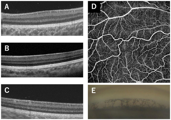 Table 1). The ocular examinations included measurements of the refractive error and visual acuity, and examinations using slit-lamp biomicroscopy, gonioscopy, and ophthalmoscopy. Optical coherence tomographic (OCT) images were recorded from all patients. OCT angiography (OCTA) images were obtained from selected patients with good visual acuity, and Patient 7 who underwent examinations under general anesthesia using SS-OCT (DRI OCT Triton, Topcon, Tokyo, Japan), and Patient 13 using spectral domain OCT (RTVue XR Avanti, Optovue, Inc., Fremont, CA, USA).