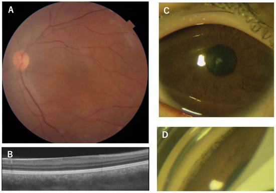 Clinical findings of Patient 11, the 21-year-old male patient with the p.Q255L mutation in the PAX6 gene. Fundus photographs shows normal retinal appearance (A). OCT image shows no foveal pit (B). Slit-lamp photograph shows no obvious changes in the iris surface, and slight cataract (C). Gonioscopic photograph shows goniodysgenesis (D). The OCT scan image was taken at a level across the presumed foveal region.