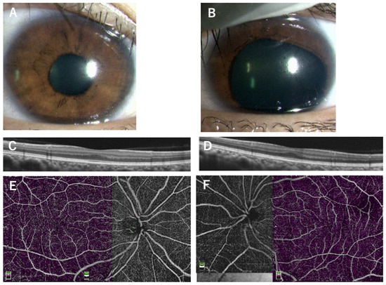 Images of a 36-year-old mother of an aniridia patient with p.V256E mutation in the PAX6 gene. The images of the iris of the right eye are normal (A) but with partial aniridia in the left eye (B). OCT and the superficial layers of OCTA images show reduced foveal pit (C,D) and no foveal avascular zone (E,F). The OCT scan images were taken at a level across the presumed foveal region.