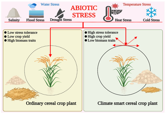 Comparative depiction of traits exhibited by ordinary and climate-smart cereal crop plants in response to abiotic stress (created with BioRender.com).