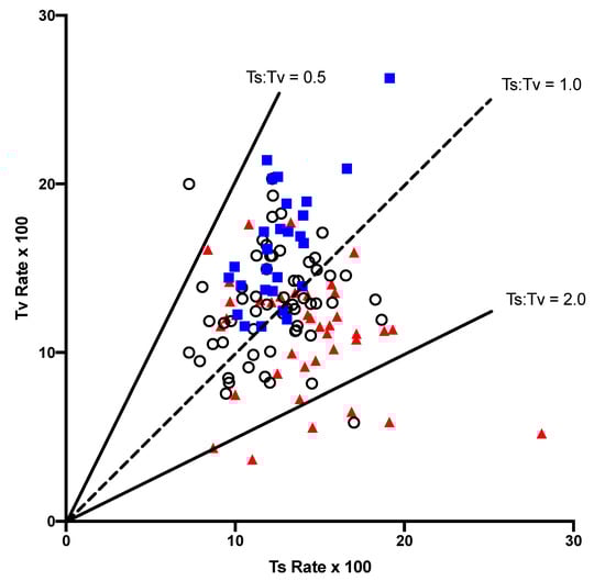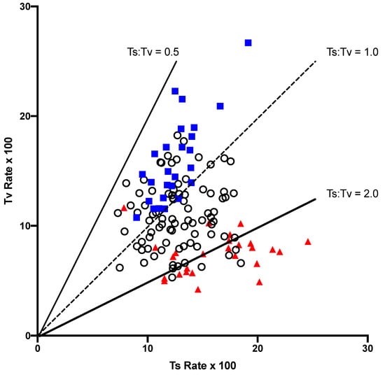 A comparison of the transition (ts) and transversion (tv) rates in each of the context-dependent matrices from the combined FFD and NC datasets. Only matrices with at least 25 substitutions are included. Contexts that have an ATI greater than 9 (A + T-rich) are indicated as blue squares, while those with an ATI < 5 (G + C-rich) are indicated by a red triangle. All others are indicated by an open circle.