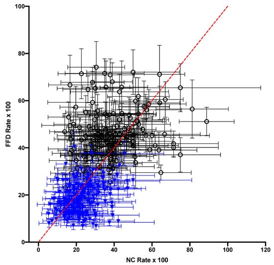 A comparison of the substitution rates from each nucleotide in each of the context-dependent matrices from the FFD and NC datasets (each point represents one row within one context-dependent matrix.) Substitutions from A or T are indicated by blue triangles, and those from G and C are represented as open circles. The line represents the equality line between the datasets.
