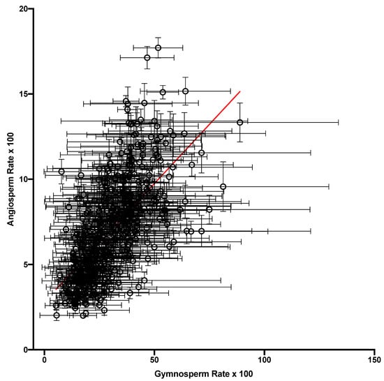 The substitution rates from each nucleotide were correlated across contexts between the FFD and NC datasets (Figure 3) in the gymnosperm, as was observed in the flowering plants. It was also observed that, as in the angiosperms, the substitutions from A and T generally had much lower rates than substitutions from G and C, which was not unexpected given the high A + T content of plastomes. However, unlike in the angiosperms, where the FFD sites had generally higher rates than the NC sites within the same tetranucleotide [11], in the gymnosperms, the data were equally distributed around the equality line, with FFD > NC for 50.9% of the points. This difference is striking, as discussed below. Although this difference between FFD and NC data was not shared between the lineages, the overall variation in the substitution rate across contexts was strongly correlated between the gymnosperm NC data and the angiosperm NC data reported by Morton (2022b) (r2 = 0.42, Figure 4). Overall, the data indicate that there was significant variation in the substitution rate, almost 100-fold, across the tetranucleotide contexts in the gymnosperm plastomes, and that these contextual effects were similar to those in the angiosperms.