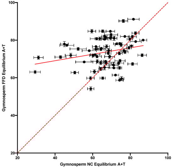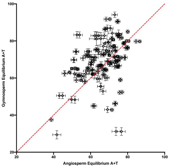 A comparison of the equilibrium A + T content of the stationary vectors of the context-dependent NC matrices from gymnosperms and angiosperms. The equality line is indicated.