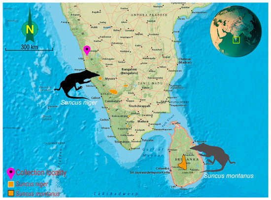 The genus of shrews Suncus (family Soricidae) comprises 18 species that are broadly distributed in Africa, Europe, and Asia, according to the most recent systematics re-evaluation (Palawanosorex ater is elevated from the genus Suncus) [1,2]. This genus Suncus (four upper unicuspids) can be distinguished from the nearest genus Crocidura (three upper unicuspids) using a dental formula [3]. A total of five Suncus species, Day’s Shrew Suncus dayi, Etruscan Shrew Suncus etruscus, Asian Musk Shrew Suncus murinus, Indian Highland Shrew S. niger, and Anderson’s Shrew Suncus stoliczkanus are inhabiting India; among them, S. dayi and S. niger are endemic to the country. The Indian Highland Shrew, S. niger with type locality = Madras in southern India [4] was treated as a subspecies of Sorex montanus (=Suncus montanus) [5], based on the external morphology [1,6]. The most current systematics evaluation distinguished these two species, S. niger for the Indian populations and S. montanus for the Sri Lankan populations [7,8]. However, these studies were restricted to previously generated genetic data of the Suncus species known as S. montanus requiring reevaluation of topotypes from its original distribution.