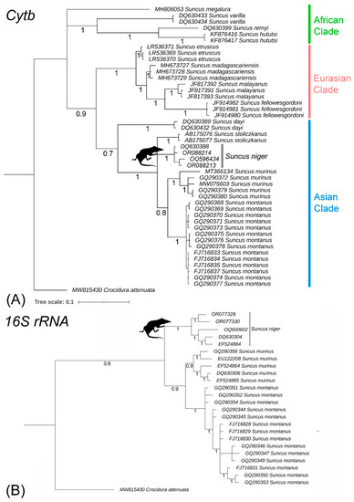 The Cytb and 16S rRNA genes unambiguously differentiated all Suncus species in the Bayesian phylogeny (Figure 4). Our sequences of S. niger showed distinct monophyletic clustering in both mitochondrial genes. Suncus niger maintained a close connection with S. stoliczkanus in the mtCytb tree, as shown in the previous study [7,25]. According to both Cytb and 16S rRNA species trees, S. niger early split from the basal node of S. montanus and S. murinus (Figure 4A,B). The mtCytb-based BA topology showed three major clades of Suncus: African clade (S. megalura, Suncus varilla, Suncus remyi, and S. hututsi), Eurasian clade (S. etruscus, S. madagascariensis, S. malayanus, and S. fellowesgordoni), and Asian clade (S. dayi, S. stoliczkanus, S. niger, S. murinus, and S. montanus) (Figure 4A). Except for S. etruscus and S. madagascariensis species complex, other Suncus species showed genetic distances between 3.68% to 7.77% in the mtCytb gene.