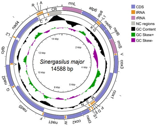 The complete mitogenome of S. major is a circular, double-stranded DNA molecule of 14,588 bp in length (Figure 1). The sequence is deposited in GenBank under the accession number OQ160840. It contains the typical set of 13 PCGs, 2 rRNA genes, and 22 tRNA genes, as well as a putative control region (CR; Figure 1). A total of 11 genes were transcribed from the majority H-strand, which included four PCGs (nad4, cox1, cytb, and nad5) and six tRNA genes (trnM, trnP, trnD, trnE, trnS2, and trnY), whereas the remaining 26 genes, comprising nine PCGs, sixteen tRNA genes, and two rRNA genes (rrnL and rrnS), were located on the L-strand (Table S3). The overall nucleotide composition was 33.5% A, 35.6% T, 14.1% G, and 14.7% C, which reveals a strong AT bias (71.1%) (Table S4). The nucleotide skew statistics showed negative AT-skew (−0.002) and negative GC-skew (−0.021).