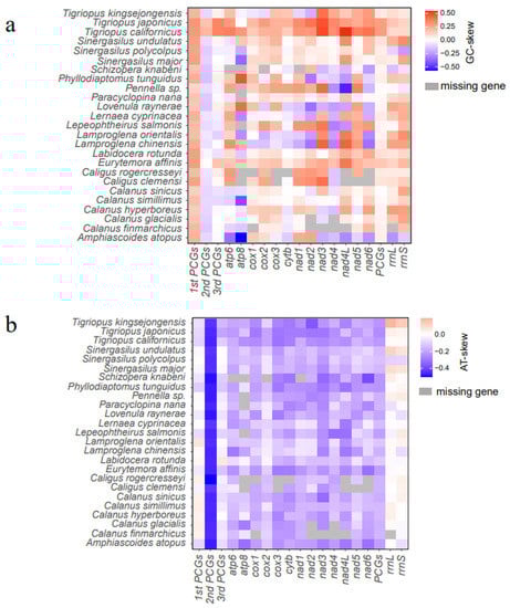 The base skews of various mitogenomic elements among the Copepoda mitogenomes. (a) The GC-skew; (b) The AT-skew.