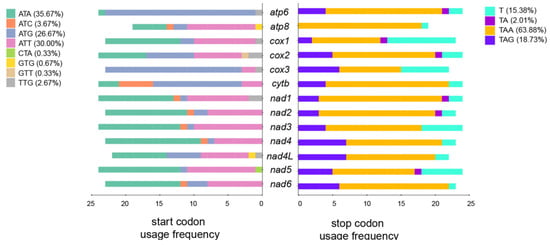Start codon and stop codon usage for the mitogenomic protein-coding genes of 25 Copepoda species.