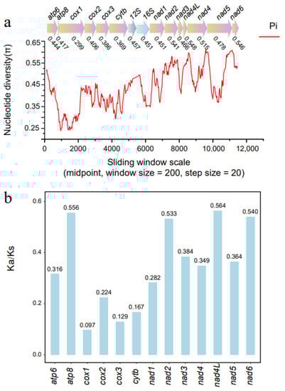 The plot of sequence variation ratio exhibits variable nucleotide diversity, with Pi values for the 200 bp windows ranging from 0.273 to 0.465 (Figure 4a). The Ka/Ks ratio for all PCGs was <1. The values of Ka/Ks were sequentially nad4L > atp8 > nad6 > nad2 > nad3 > nad5 > nad4 > atp6 > nad1 > cox2 > cytb > cox3 > cox1 (Figure 4b).