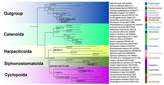 The subgroup_2 dataset of sparser taxon sampling restored Harpacticoida as the closest relative of Siphonostomatoida like the previous study, which further indicates that sparse taxon sampling might be responsible for those earlier results []. Except for the unstable relationship within the Cyclopoida order in the subgroup_2 dataset, the relationships among the remaining three orders of Copepoda (Calanoida, Harpacticoida, and Siphonostomatoida) were identical to the topology obtained using the subgroup_1 dataset. Although taxon sampling had an impact on the relationships among certain families and genera, it did not affect the monophyly of Copepoda. Our research findings provide robust evidence supporting the monophyly of Copepoda, which is also supported by morphological studies [,] as well as large-scale phylogenomic analyses [,].